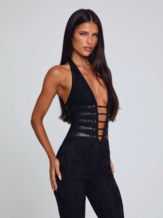 Crafted from our signature lace mesh fabrication, this flattering jumpsuit showcases all of your best assets. Featuring a low-cut neckline, lined mesh and an adjustable necktie up feature! Completed with PU strap detailing at the waist with eyelet hardware, along with an open lattice, criss-cross back.