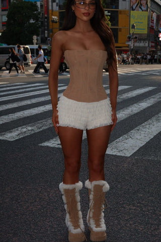 Crated from a mesh fabrication and fully lined for comfort, Bayley is designed with layered ruffle frills and a body-con fit. They sit low on the waist and are adorned with a scalloped, elasticated waistband complete a dainty bow to add a feminine touch.