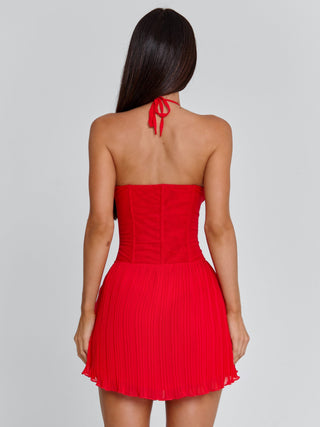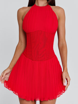 Crafted from lightweight plissé georgette with a structured power mesh bodice, Calla is designed to sculpt through the waist while keeping the look soft and feminine. The halter neckline creates a clean, flattering shape, while the full mini skirt adds movement and volume. Finished with a zip closure at the back for a smooth fit.
