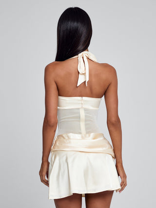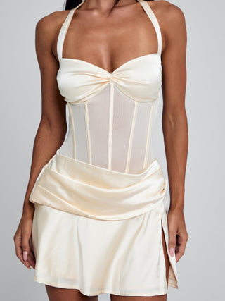 Crafted from luxurious satin with a sculpted power mesh bodice, she features internal boning for structure and support. The softly gathered bust and waistband highlight the feminine figure, while the mini-length skirt drapes effortlessly to flatter every movement. Lined through the bust and skirt, Carmin promises both comfort and confidence! Finished with a centre-back zip for a seamless fit!