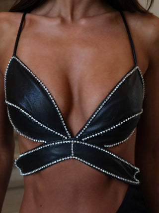 Crafted from a PU fabrication at the bust, detailed with a silver diamante trim, she features a tie-up halter neckline and an open back with corset-style ties for a sculpted fit. The body-con silhouette accentuates your shape, while the flounced hem adds a touch of movement. Fully lined for comfort, she’s the perfect mix of structure and edge.