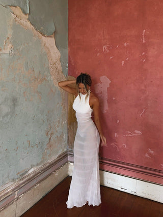 This stunning maxi is crafted from a textured sheer fabric, adding an effortlessly ethereal feel to your look. Designed with a mock high neck and a lined bust for just the right amount of coverage, the Diana Maxi skims your figure beautifully while embracing a sophisticated and modern silhouette. The sheer detailing flows into the floor-length skirt, making it a perfect choice for when you want to feel dreamy and unforgettable.