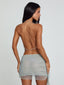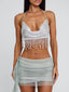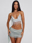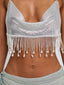 She’s crafted from glow-mesh fabrication with a soft cowl neckline and a cropped length. Diamante fringing along the hem adds movement and shine, catching light with every step. Finished with a clasp closure at the halter neckline, she sits securely while keeping the look open and effortless.