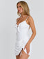 Crafted from crisp cotton poplin with a soft lining, she features a fitted silhouette at the bodice with adjustable shoulder straps and delicate ruffle detailing along the bust. A bow at the front adds a feminine touch, while the lace skirt overlay creates subtle texture and dimension. Finished with side ruching and a drawstring detail, Gigy is designed to flatter with a clean, refined finish.