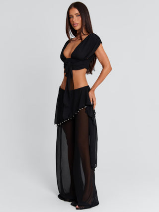 Meet our Haillie Pants, a relaxed and flowy style designed to sit low on the hips. Crafted from semi-sheer georgette, she features a wide leg silhouette and an asymmetrical overlay with subtle stud detailing. Lightweight and easy to wear, she’s perfect for pairing with the matching top or styling over swim.