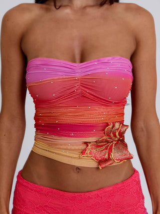 Crafted from a printed ombré mesh fabrication, she blends vibrant pink, orange and sunset tones for a bold statement finish. Designed in a strapless silhouette, she contours the bust with heavy gathering through the side seams and centre front for a flattering, sculpted fit. Heat press diamante detailing adds subtle shine, while an applique feature elevates the design. Finished with internal grip tape along the bust edge for secure wear, she’s made to stay in place from day to night.