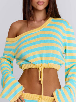 Crafted from fully fashioned knit, she features an oversized silhouette with an asymmetric neckline that drapes effortlessly off the shoulder. Designed with an elasticated rib underbust and adjustable tie, she blends a relaxed feel with a flattering shape. Perfect for spring break, vacation days, and casual summer styling.