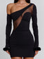 Crafted from stretch fabrication with sheer mesh paneling, she shapes the body while adding a touch of contrast through texture. The asymmetric off-shoulder neckline brings a modern edge, complemented by faux-fluff cuffs that add a playful touch. Finished with a smooth zip closure and a clean, body-con fit!