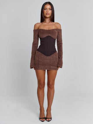 Our Juno Mini Dress in Brown is a cosy-meets-confident silhouette designed for cooler nights out.