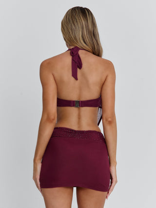 Designed in a soft mesh fabrication, she features an adjustable halter neckline with an included bandeau for coverage. Diamante hot press detailing across the bust overlay and waistband adds a subtle statement, while the mini-length silhouette and fully lined skirt create a clean, flattering finish.