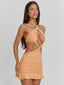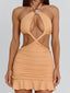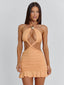Crafted from stretch jersey, the Livai Mini Dress in peach features a halterneck design with braided detailing across the neckline, waist and hem.