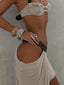 Crafted from stretch knit and lined in poly-knit, she features a halter neckline with contrast PU straps finished with antique brass buckle accents. Frill detailing along the bust adds a feminine touch, while the underwire structure provides subtle support.