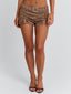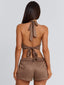 Meet our Mason Shorts in Brown, a statement mini short designed with bold hardware detailing. Crafted from soft faux suede and lined in poly-knit, she features a structured waist belt with a silver buckle and lace-up detailing along the sides for an edgy finish. Silver eyelets enhance the design while maintaining a sleek festival-ready look.