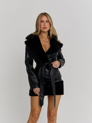Crafted from smooth PU and fully lined for comfort, she features a soft faux fur hem with contrast whip stitching for a subtle edge. Finished with an invisible zip closure and a body-con silhouette, she pairs perfectly with the Mirena Jacket or a sleek bodysuit.