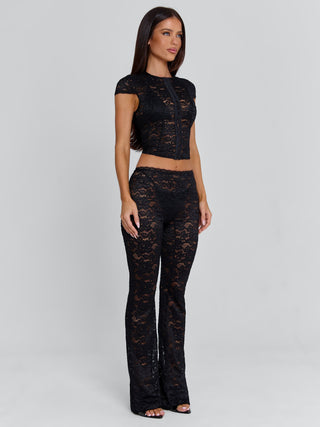Crafted from stretch lace, Mirra is designed to sit low on the waist with a fitted, straight-leg silhouette. A side zip ensures a smooth fit, while the scalloped lace trim at the waist adds a refined finish. Includes separate undergarments for coverage while maintaining the sheer lace look.