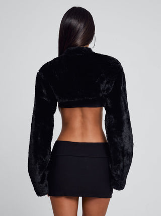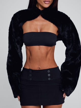 Crafted from luxurious faux fur, she features a cropped silhouette with long sleeves and a front hook closure for an elegant finish. Perfect for draping over party looks or styling with sleek minis, she’s designed to add a touch of glamour to any NYE or evening fit.