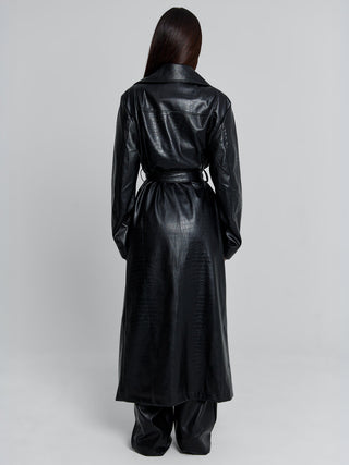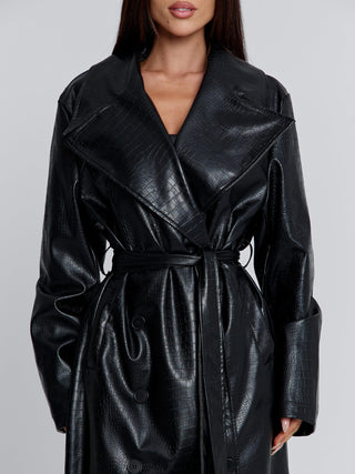 Crafted from a croc-embossed PU fabrication, this trench brings a bold, modern edge to a timeless silhouette. The oversized lapels exude sophistication, while the self-tie waist belt allows you to cinch in for a feminine, hourglass shape. Fully lined for comfort and warmth, Nolita blends functionality with fashion.