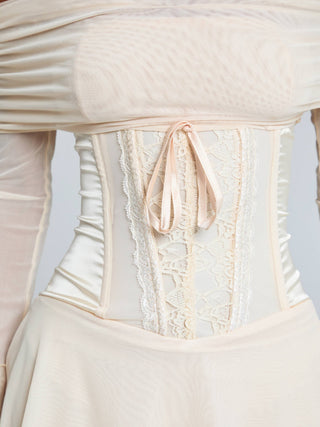Designed with a mesh overlay and sleeves, she features a sculpted bodice made from satin, lace, and mesh, complete with supportive boning for a flattering fit. An adjustable lace-up back allows you to customise the shape, while the fully lined skirt keeps her comfortable and easy to wear.