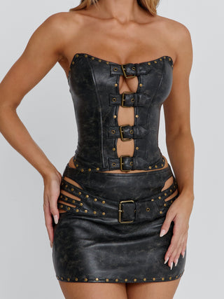 Crafted from a PU fabrication, Rodeo has a form fitting design. She features decorative studs along the seams and cut-out sections at the hips to reveal some skin. She is complete with a buckle feature at the centre front!