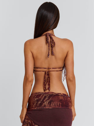 Meet our Rosailina Top in Rayella, a statement bralette designed with intricate detailing. Crafted from printed stretch mesh and lined in poly-knit, she features a halter neckline finished with a braided fabric trim. Beaded fringe cascades from the bust, adding texture and movement, while adjustable ties at the back and side allow for a customised fit.