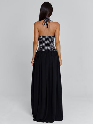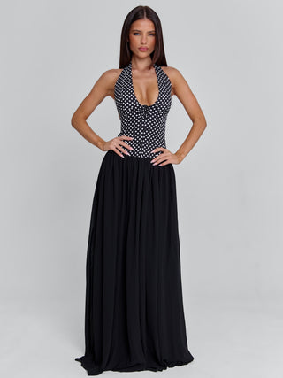 Designed as a maxi update of our best-selling Piai top, Rylie features a fitted stretch woven bodice with a soft polka dot print and subtle floral detail at the front. The bodice contours the body before flowing into a full georgette skirt in contrast black, creating an effortless, elongated silhouette.