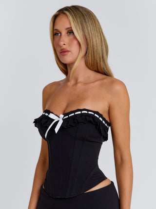 Crafted from a stretch woven fabrication, this strapless design features a sweetheart neckline, trimmed with delicate lace frills and finished with a contrast white satin bow. A lace-up corset back allows for an adjustable fit, while a side seam zipper ensures ease of wear.