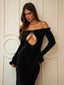 Crafted from luxe velvet fabrication, she features a flattering body-con silhouette that sculpts and smooths the figure. The off-shoulder neckline and keyhole bust cut-out add a sultry edge, finished with faux fur trim along the top, cuffs, and hem for a touch of vintage elegance. A delicate silver dangle hardware detail at the front completes the maxi!