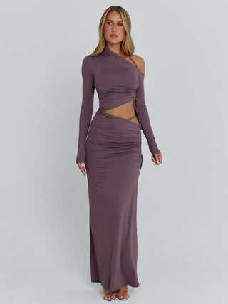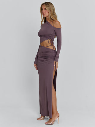 Crafted from a soft jersey fabrication, she contours the body with a smooth, flattering fit. Adjustable drawstring detailing through the bust and skirt allows for a custom silhouette, while the cut-out at the waist adds a modern finish.