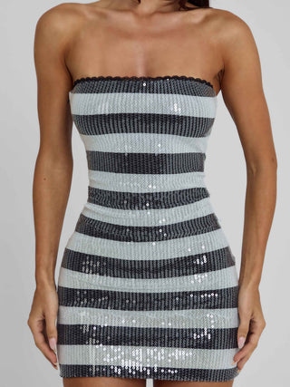 Meet our Tahira Mini Dress in Black Stripe, she’s a statement sequin mini made for party nights.