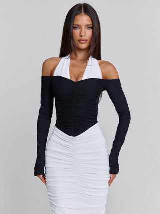 Our Tahiti Maxi Dress in White is a soft, sculpting silhouette crafted from stretch jersey that moves beautifully with the body. Designed with contrast bust panels and a halter tie, she frames the neckline elegantly while the open back and clasp closure add a refined, modern touch. Finished with long sleeves and a gathered maxi skirt, she’s the perfect choice for New Year’s Eve, formal events, and any evening you want something effortlessly head turning.