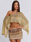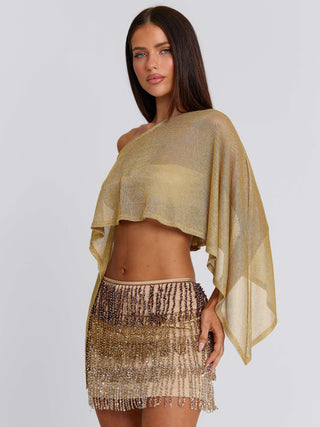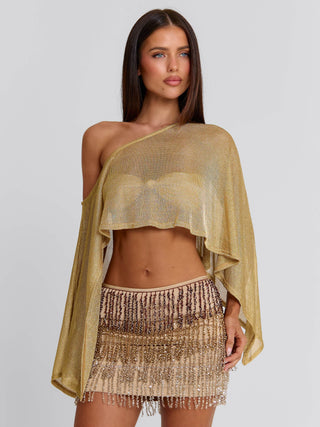 Meet our Valina Top in Gold, an effortless statement top made for your next party or festival! Crafted from metallic lurex knit, she drapes softly across the body with an asymmetrical poncho-style silhouette that feels relaxed yet elevated. The lightweight design and pull-on fit make her an easy piece to style, bringing subtle shimmer.