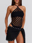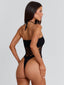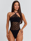 Meet our Vivi Bodysuit in Black, a statement halter design crafted with open-weave detailing. Made from stretch stocking fabrication, she features a bold cut-out knit pattern through the body balanced by a separate bandeau for coverage. Designed with a functional halter neck tie and a flattering G-string silhouette, she pairs effortlessly with skirts, sarongs, or festival styling.