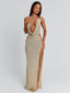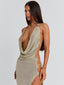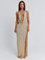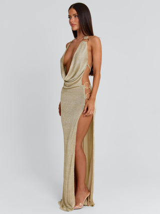Meet our Yasmina Maxi Dress in Gold, a striking silhouette designed for special occasions. Crafted from metallic lurex knit, she drapes softly with a plunging cowl neckline and halter design. Gold hardware details at the bust and hip elevate the look, while a high thigh split adds movement to the silhouette.