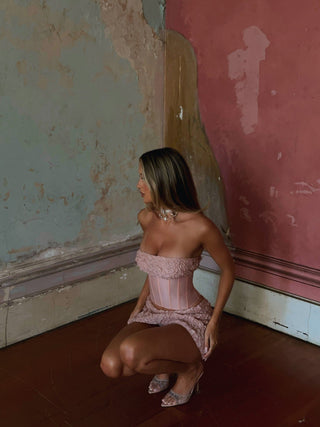 Our gorgeous Zafia is crafted from a textured woven fabric that provides an intricate and unique finish. Featuring boning for a structured fit and a delicate lace-up back that allows you to adjust to perfection, she is all about combining comfort with romantic charm. The soft rose color is complemented by the delicate texture, creating a look that's undeniably enchanting.